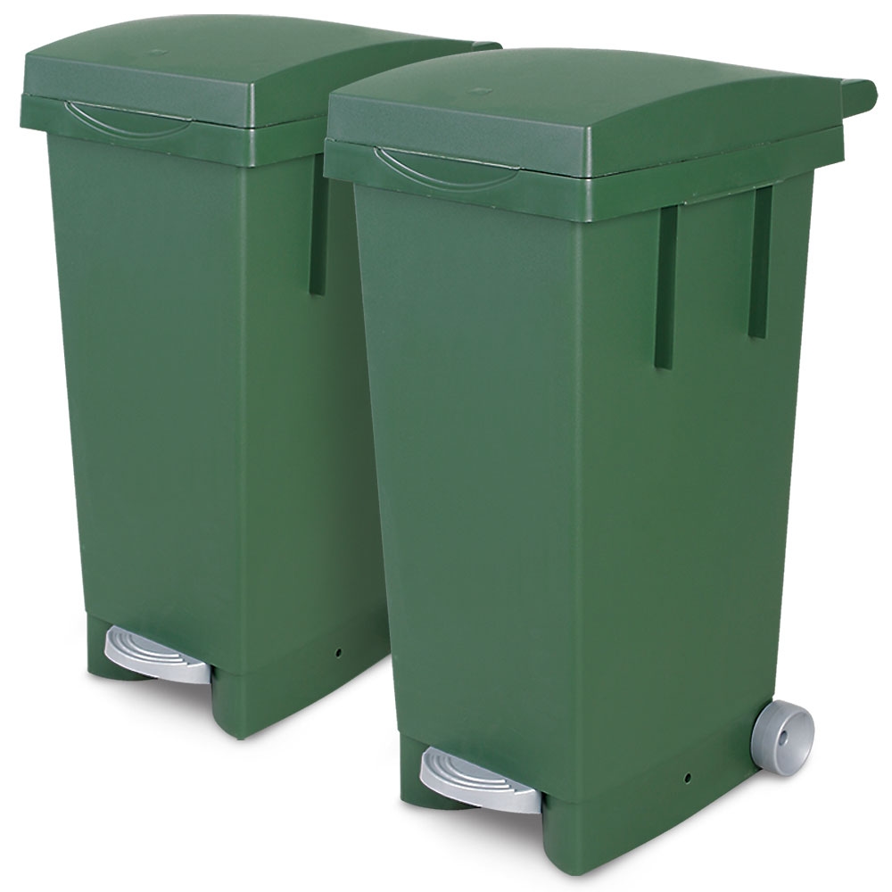 BRB Set, 2X 80 Liter Abfallbehälter mit Rollen, grün, Fußpedal, selbstschließender Deckel, Klemmring für Müllsäcke