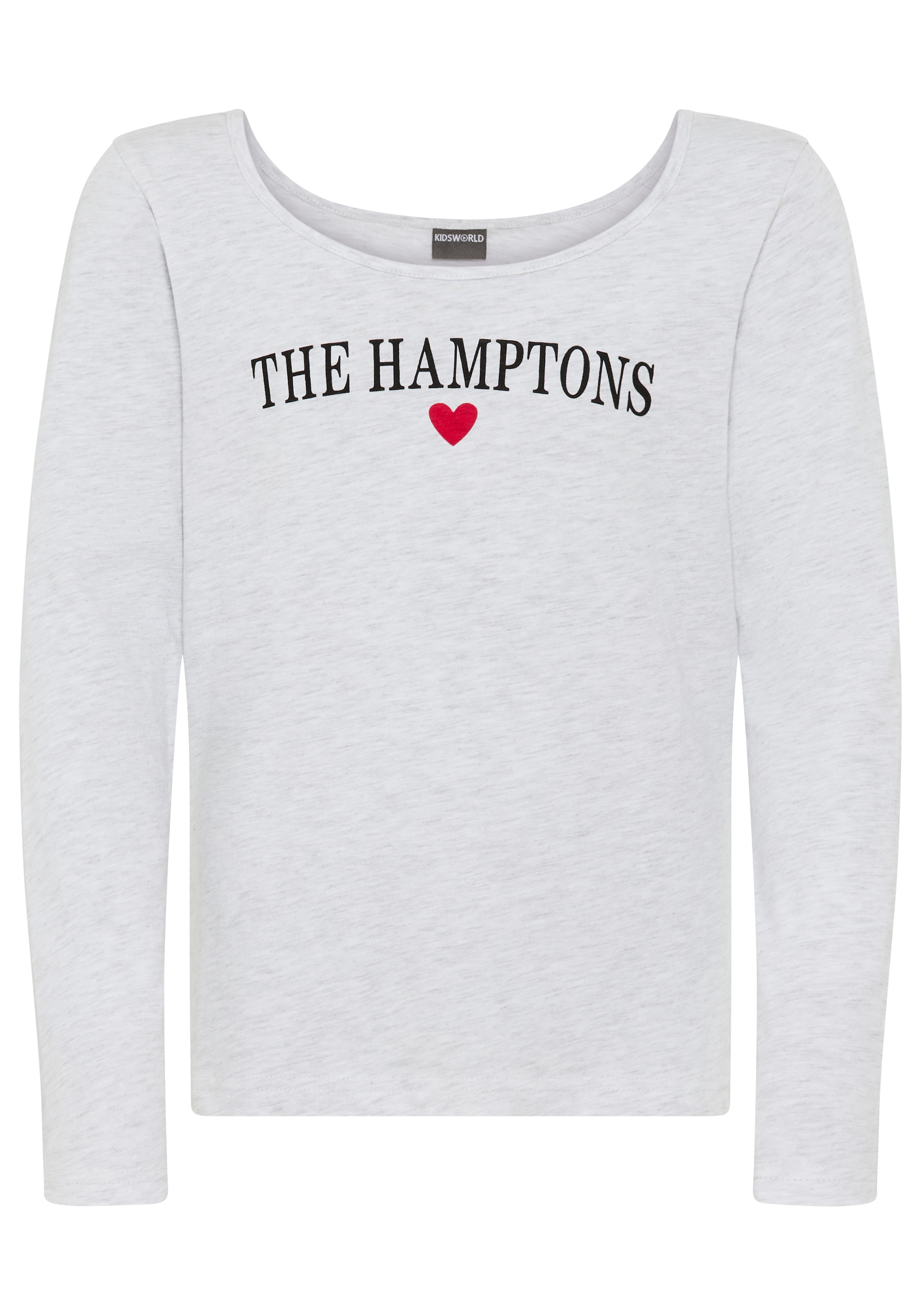 Langarmshirt KIDSWORLD "Shirt mit Hamptons-Druck für Mädchen", Mädchen, Gr. 176/182, grau (hellgrau meliert), Jersey, Obermaterial: 99% Baumwolle, 1% Viskose, bedruckt, figurbetont hüftlang, U-Boot-Ausschnitt, abgesteppte Kante, Shirts, Tieferer...