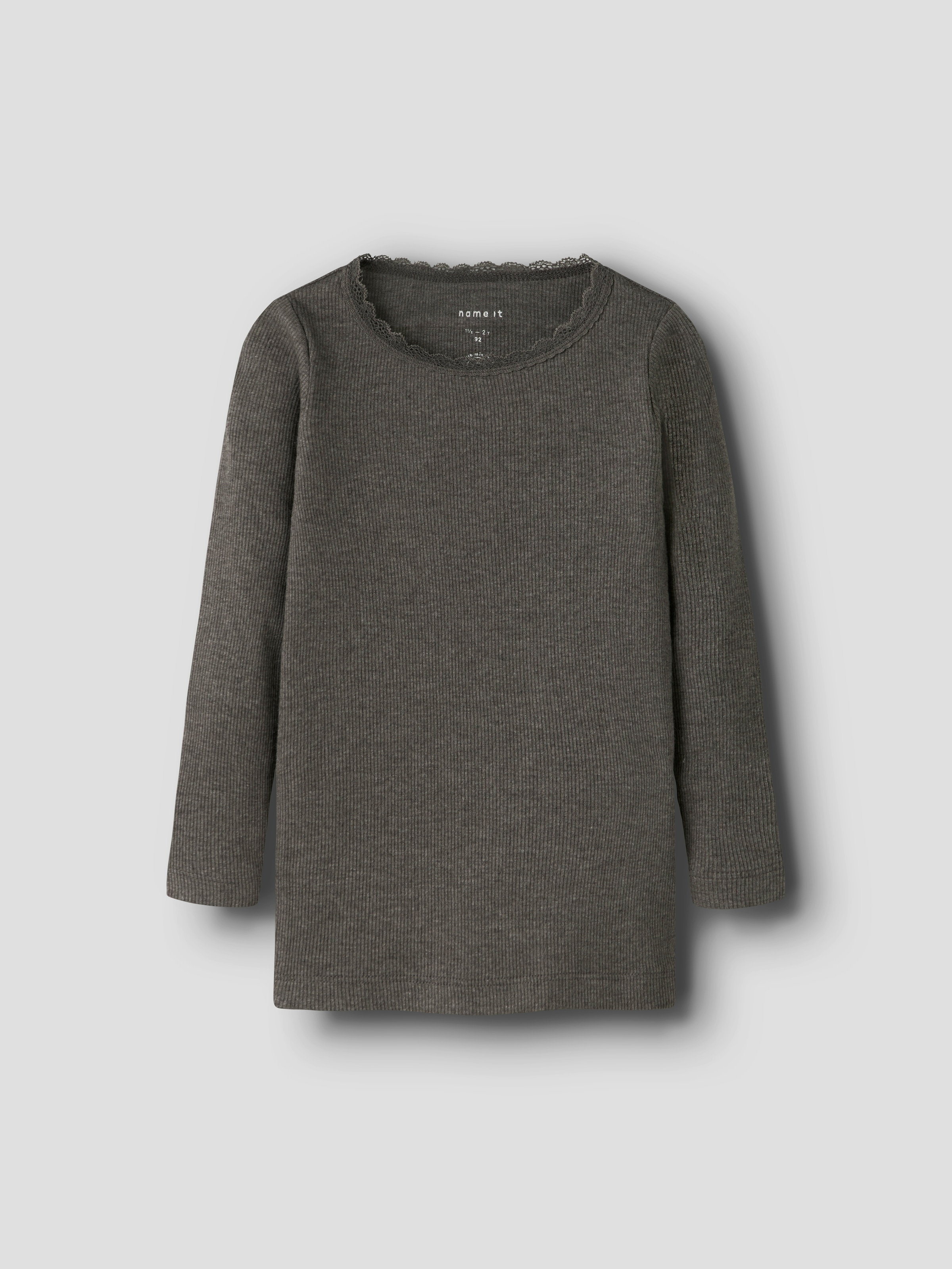 Langarmshirt NAME IT "NMFKAB LS TOP NOOS", Mädchen, Gr. 98, delicioso detail:melange, Feinripp, Obermaterial: 57% Baumwolle, 38% Modal, 5% Elasthan, meliert, unifarben, regular fit hüftbedeckend, Rundhals, abgesteppte Kante, Shirts, in Feinripp und...