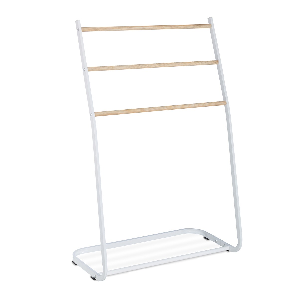 Relaxdays Handtuchhalter stehend, Metall, 3 Sprossen in Holzoptik, Handtücher & Kleidung, HxBxT: 87 x 58 x 29,5 cm, weiß