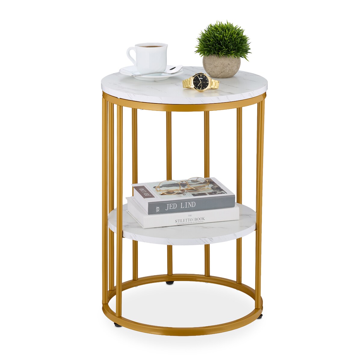 Relaxdays Beistelltisch Marmoroptik, 2 Ablagen, für Wohnzimmer, Metall & MDF, Sofatisch rund, HxD 57x40 cm, weiß/gold