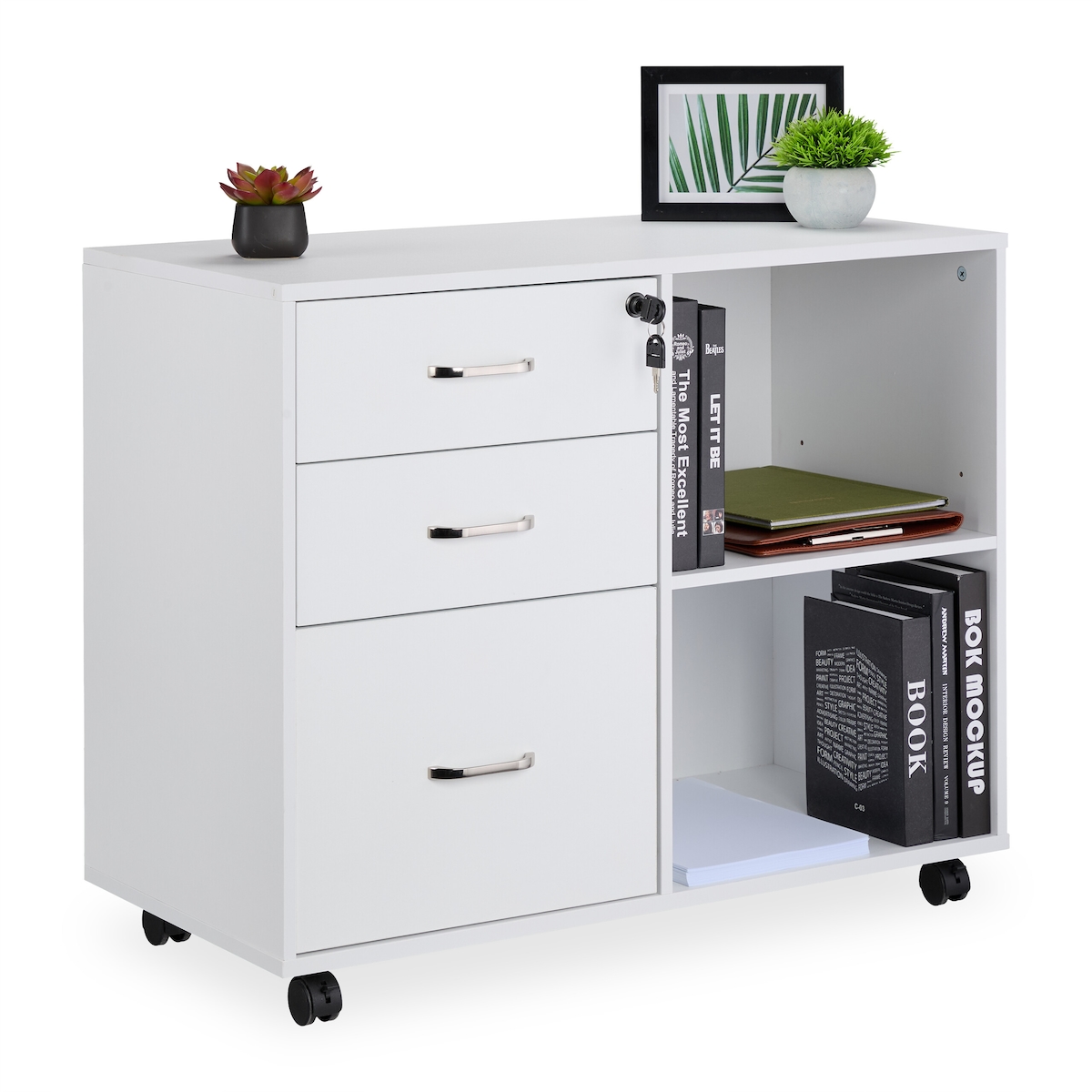 Relaxdays Rollcontainer, 3 Schubladen, 2 Fächer, Hängeregister, HxBxT: 66x80x40 cm, abschließbarer Aktenschrank, weiß