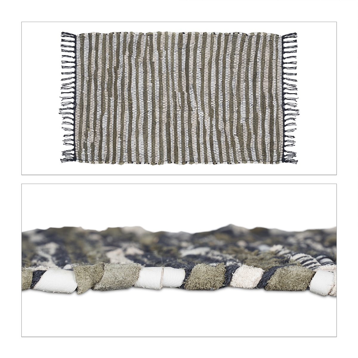 Relaxdays Flickenteppich, 60x100 cm, Baumwolle & Leder, handgewebt, mit Fransen, rutschfest, Fleckerlteppich, grün/beige