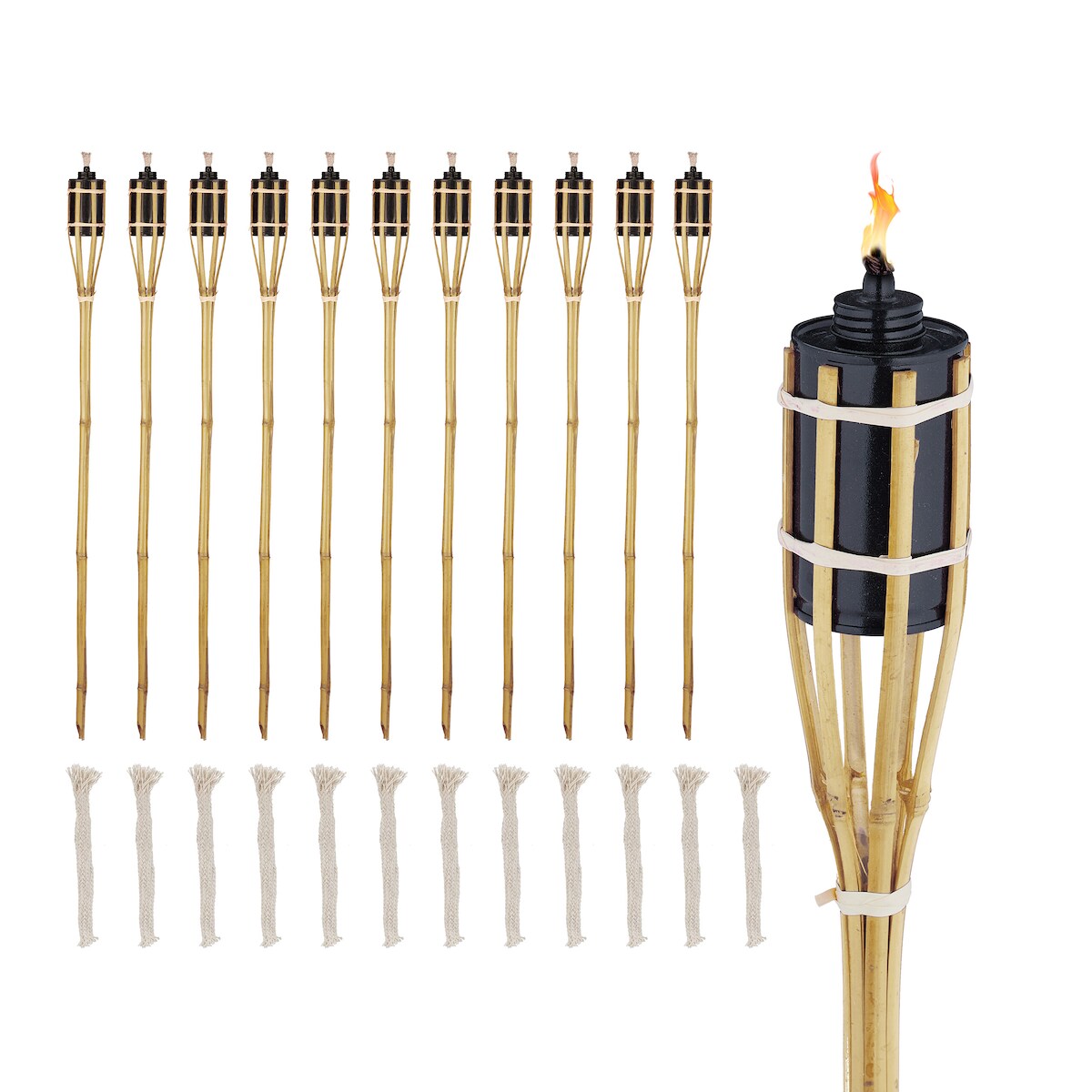 Relaxdays Gartenfackeln für draußen, 12er Set, 90 cm, Bambusfackeln Gartenparty Deko, Ölfackeln mit Ersatzdocht, natur