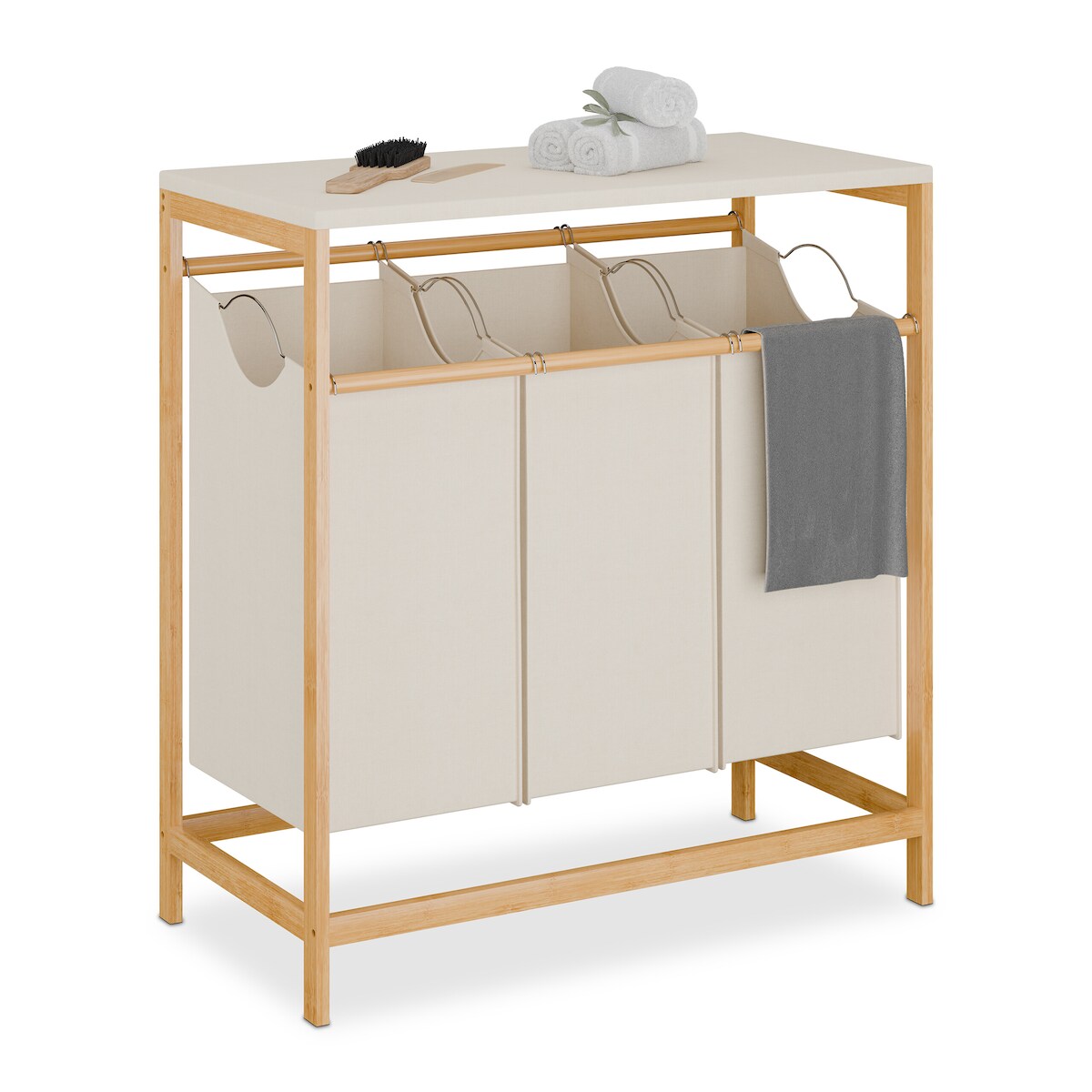 Relaxdays Wäschesammler mit 3 ausziehbaren Wäschekörben, klappbare Ablage, HBT: 84,5 x 78,5 x 40 cm, Bambus, natur/creme