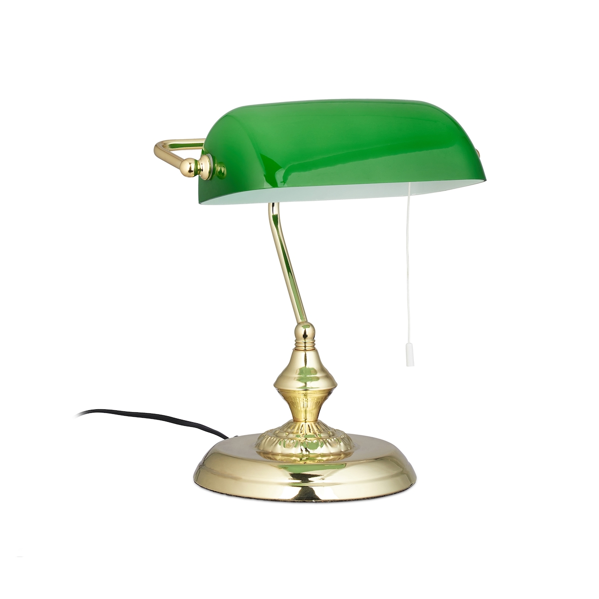 Relaxdays Bankerlampe mit Zugschalter, grüner Schirm, runder Sockel, Vintage Design, Glas, HBT: 31x22,5x18,5cm, messing