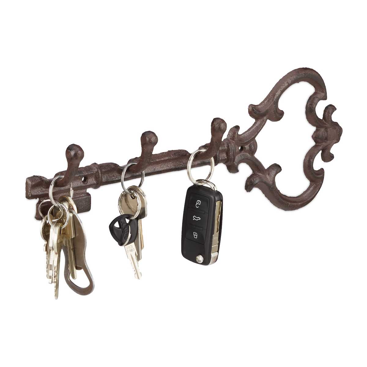 Relaxdays Schlüsselbrett, 3 Haken, dekorative Schlüsselform, Vintage, antik, Gusseisen, HBT 12,5 x 33 x 4,5 cm, braun