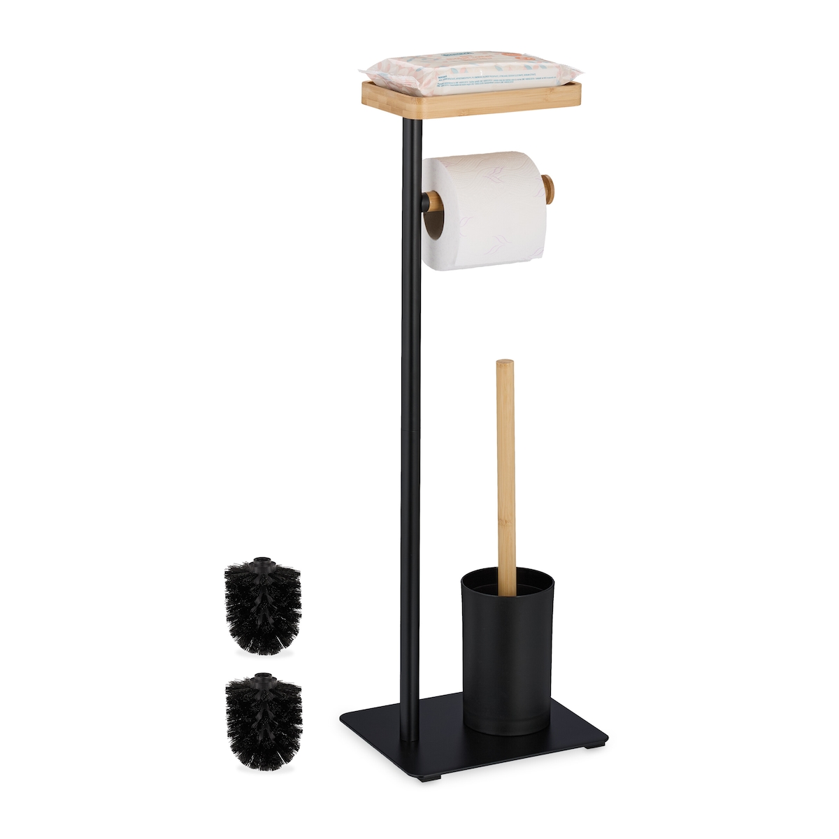 Relaxdays WC Garnitur, Bambus, Eisen, freistehender Klopapierhalter, Toilettenbürste mit Bürstenhalter, schwarz/natur