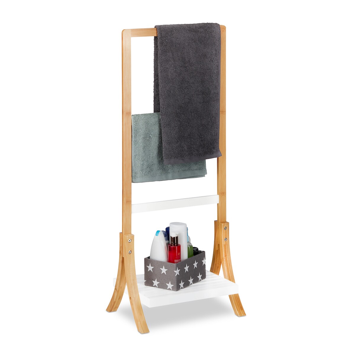 Relaxdays Handtuchhalter Bambus, mit Ablage & 3 Handtuchstangen, freistehender Handtuchständer, 103x41x28cm, natur/weiß