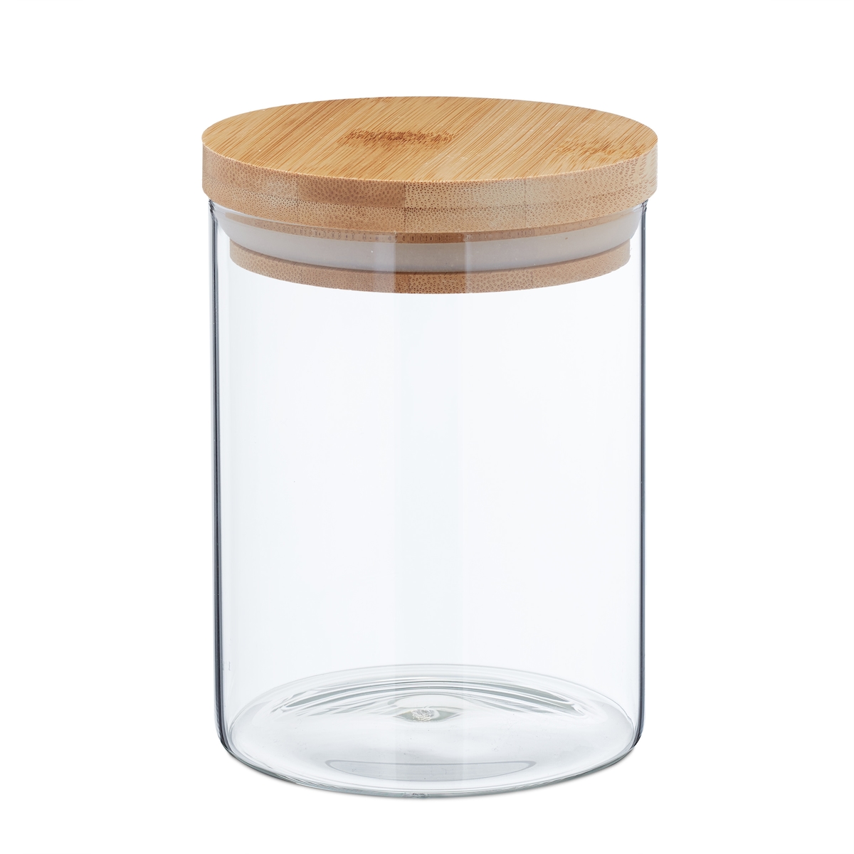 Relaxdays Vorratsgläser mit Bambusdeckel, 3er Set, runde Vorratsdosen aus Glas, 650 ml, luftdicht, transparent/natur