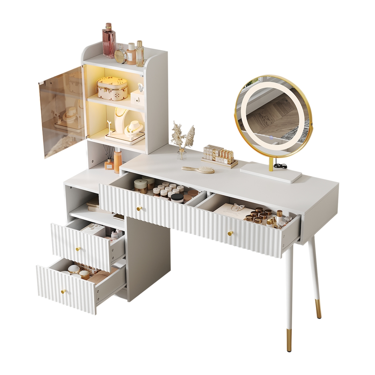 OKWISH Schminktisch-Set Frisiertisch Kosmetiktisch mit LED-Spiegel dreifarbig 4 Schubladen Glasvitrine Stauraum 100x40x125 Weiß