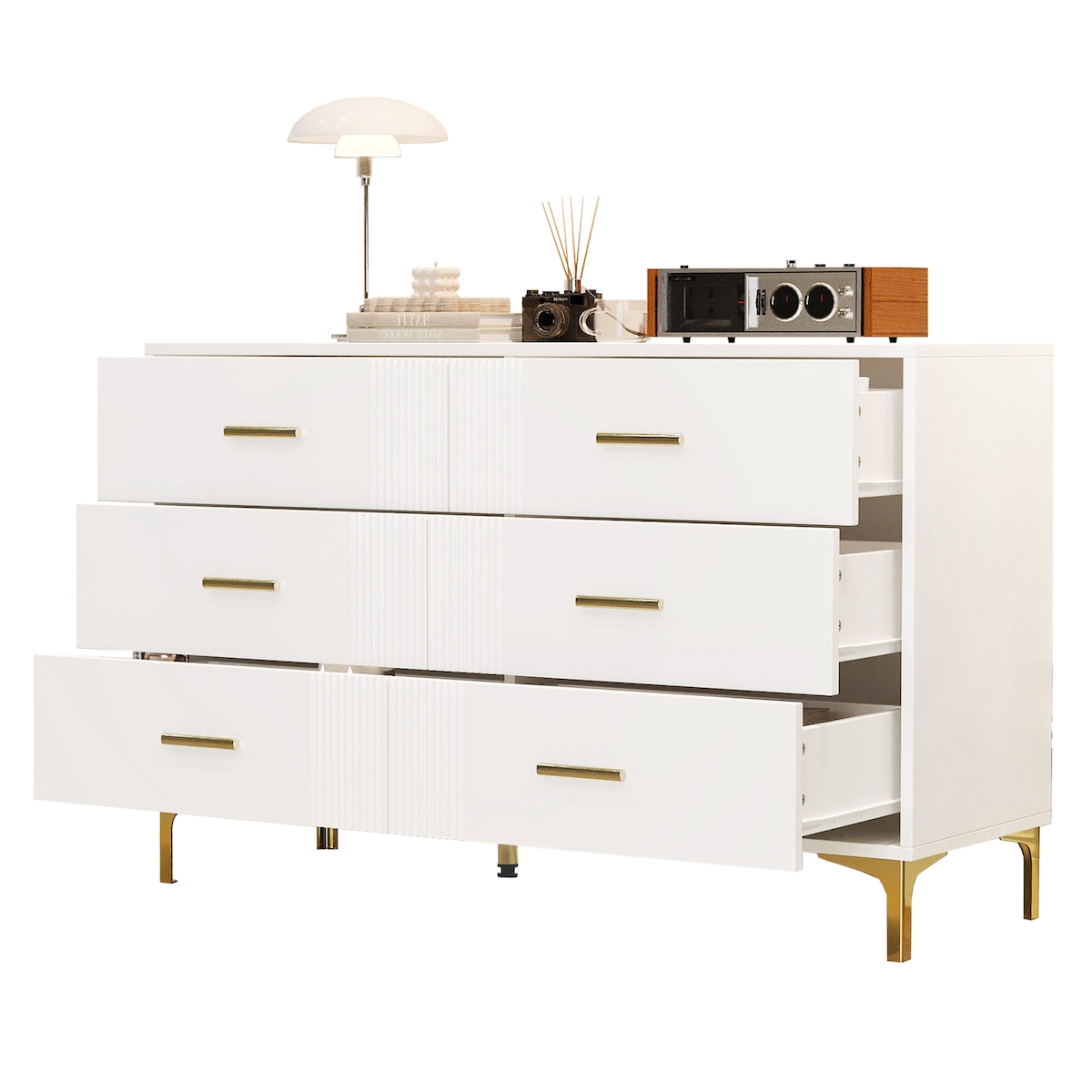 OKWISH Kommode Sideboard 120x40x76 mit 6 Schubladen gestreifter Front stabilen Füßen hochwertigem MDF Stauraum Anrichte modern Weiß