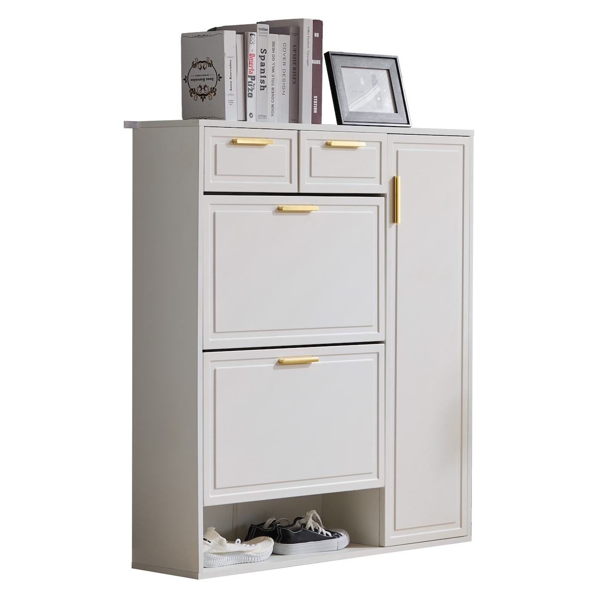 OKWISH Schuhschrank 95x24x107 Weiß mit verstellbaren Regalen 2 Schubladen goldene Griffe MDF Spanplatte Flur Eingangsbereich Anti-Kipp