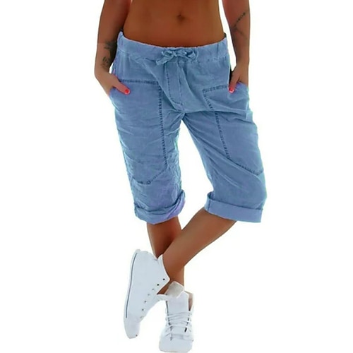 Damen Caprihose Hose aus Baumwollleinen Stoffhosen Streetwear Lässig Wadenlang Natürliche Taille Einfach Tasche Elastisches Kordelzugdesign Bequem Außenbereich Outdoor Ferien Wochenende Weiß Rosa