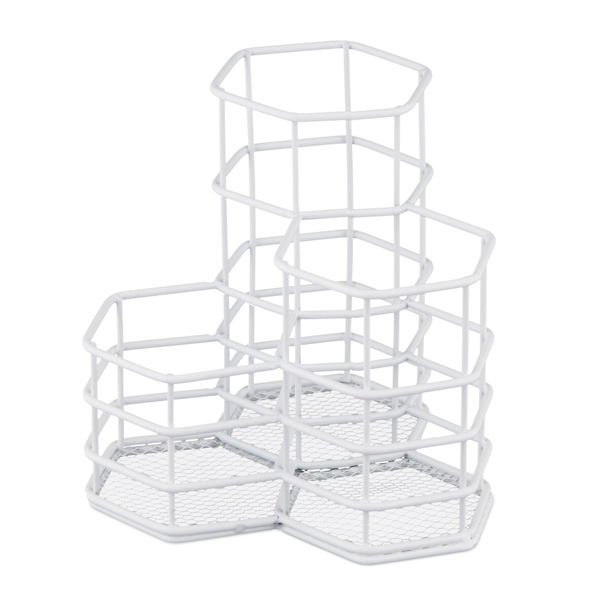 Relaxdays Pinselhalter, 3 Fächer, sechseckig, H x B x T: 12,5 x 12 x 12,5 cm, Draht, Stiftebecher Schreibtisch, weiß