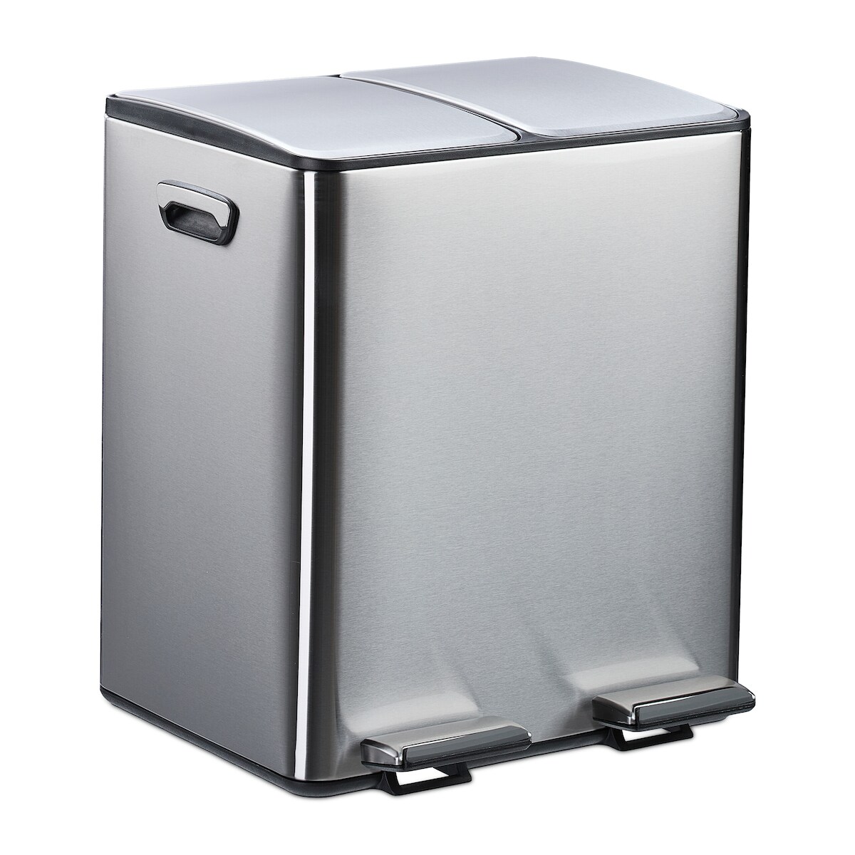 Relaxdays Mülleimer, 2 Fächer, je 15 l, entnehmbare Inneneimer, Fußpedal, Küche, Tretmülleimer, Eisen, silber/schwarz