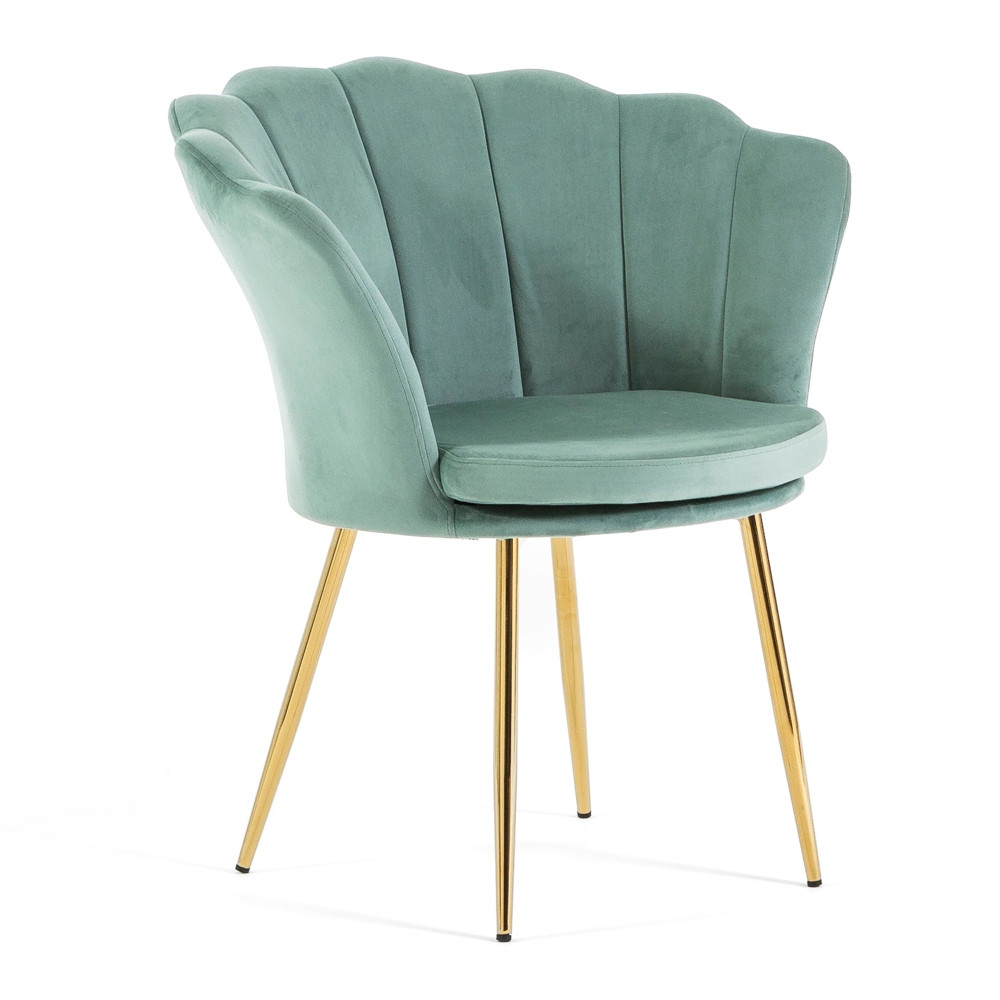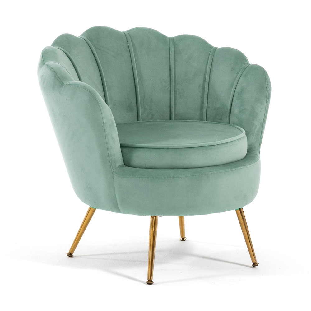 RATTATAN Samtstuhl für den Innenbereich in Muschelform, elegantes Design, mit Metallfüßen, ideal für Schlafzimmer oder Wohnzimmer – Perla – Mintgrün/Gold