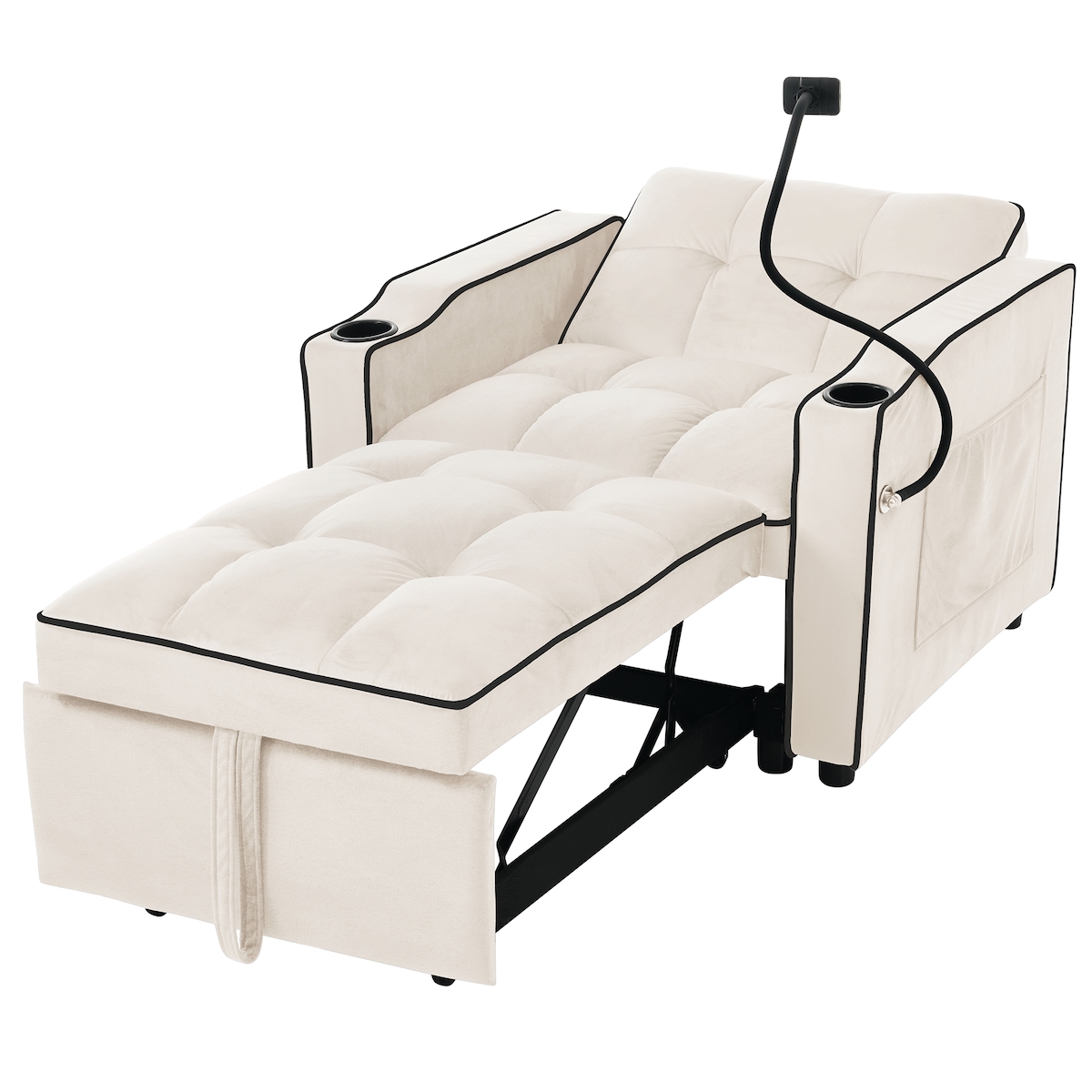 OKWISH Kompaktes 3-in-1 Schlafsofa Einzelsessel Liegestuhl ausziehbar mit Samtbezug, Getränke- und Handyhalter, Seitentasche, beige, 83x167x76 cm