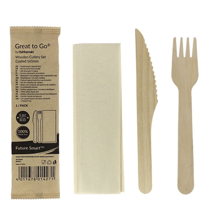 MONOUSO - Holzbesteck mit Wachsschicht Gabel, Messer und Serviette (250 Stück)
