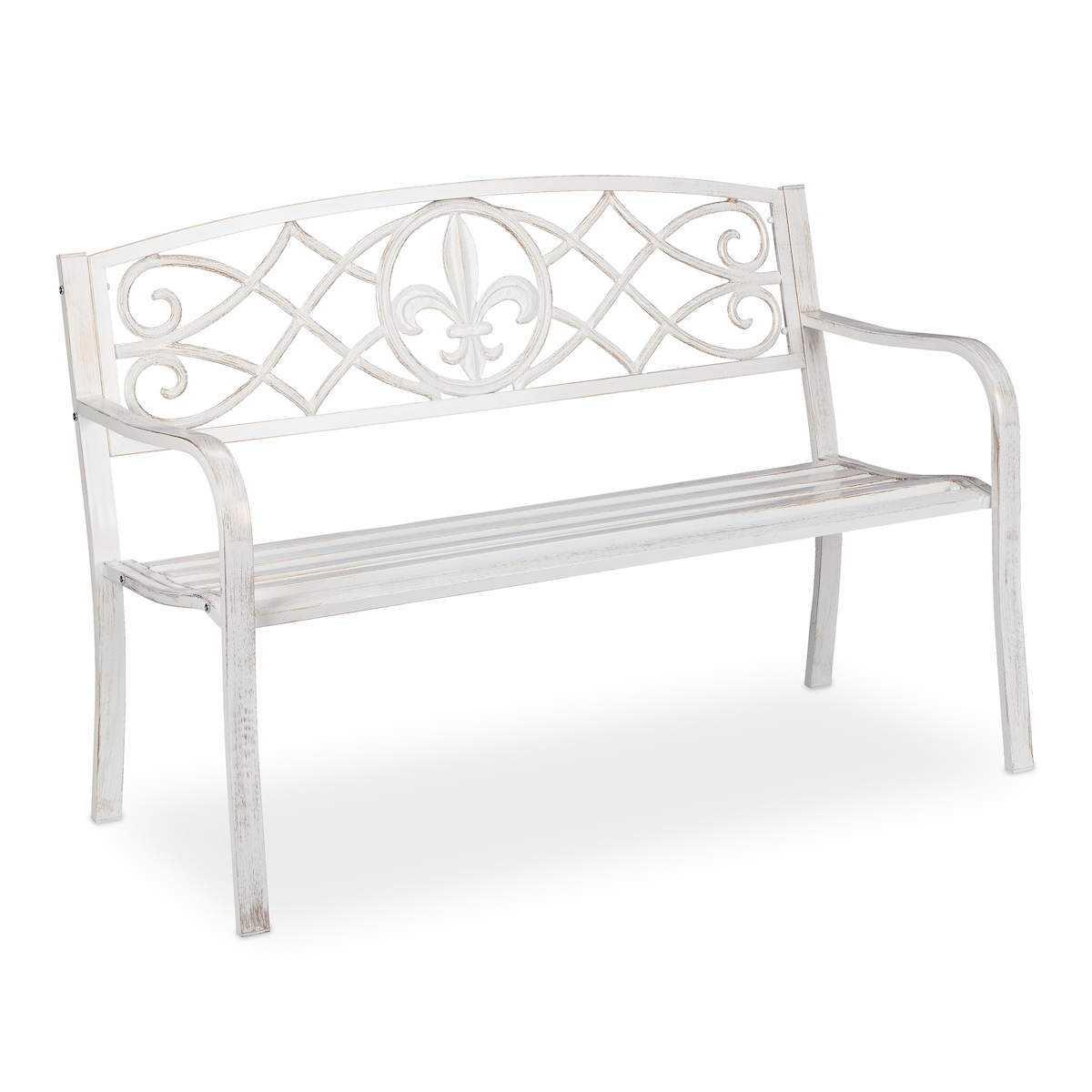 Relaxdays Gartenbank, stabile Parkbank aus Metall, Sitzbank mit gusseiserner Lehne für draußen, 86x127x57cm, weiß/bronze
