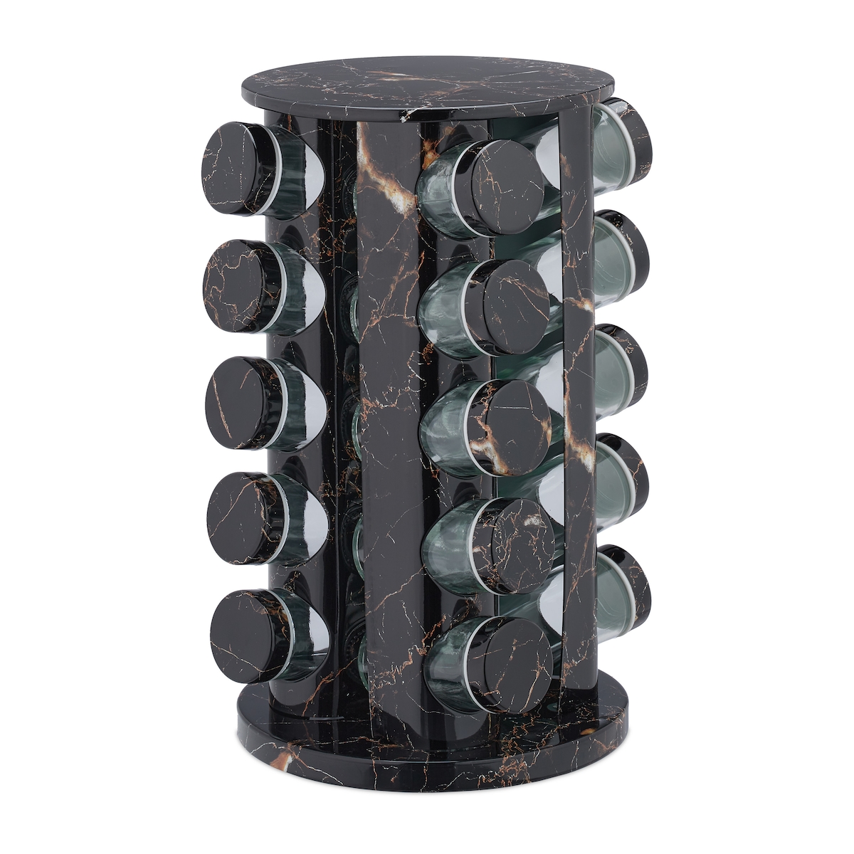 Relaxdays Gewürzkarussell mit 20 Gewürzgläsern, mit Streueinsatz, drehbar, nachfüllbare Gewürzbar, Marmoroptik, schwarz
