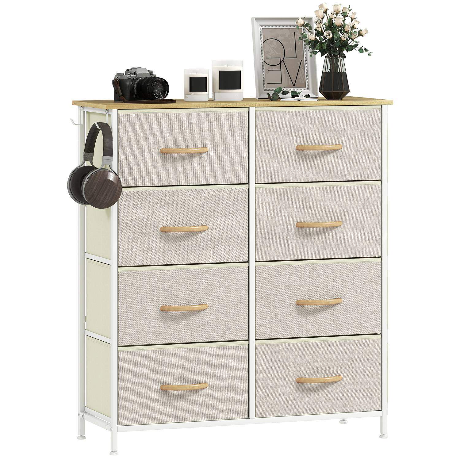 Soveværelseskommode med 8 stofskuffer, stålramme, beige