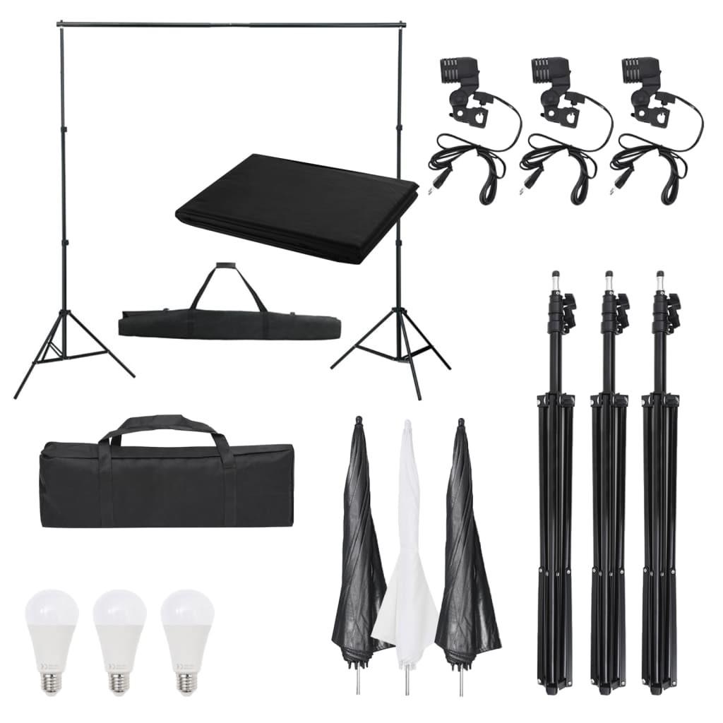 Fotostudieudstyr med baggrund, lamper og paraplyer