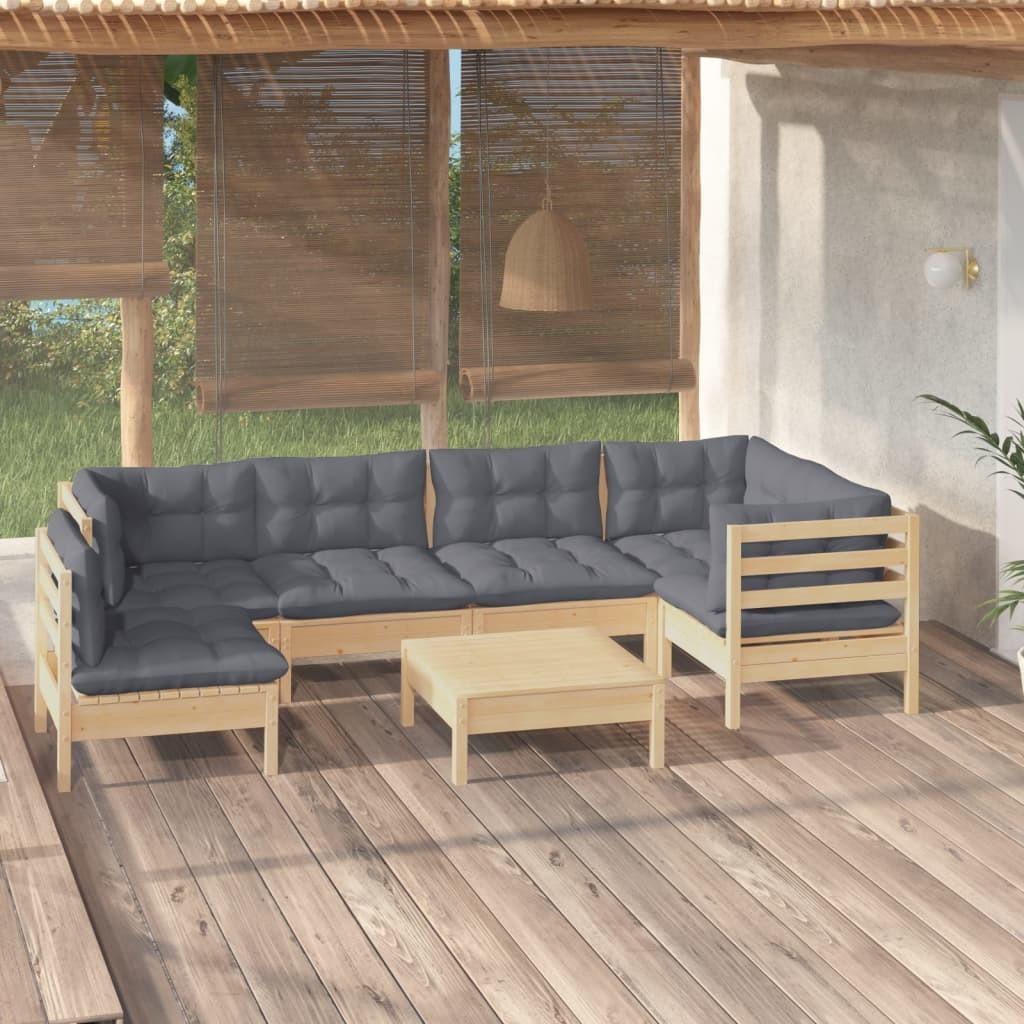 Loungesæt til haven 7 dele med grå hynder fyrretræ