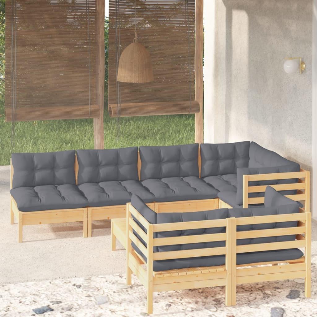 Loungesæt til haven 8 dele med grå hynder massivt fyrretræ