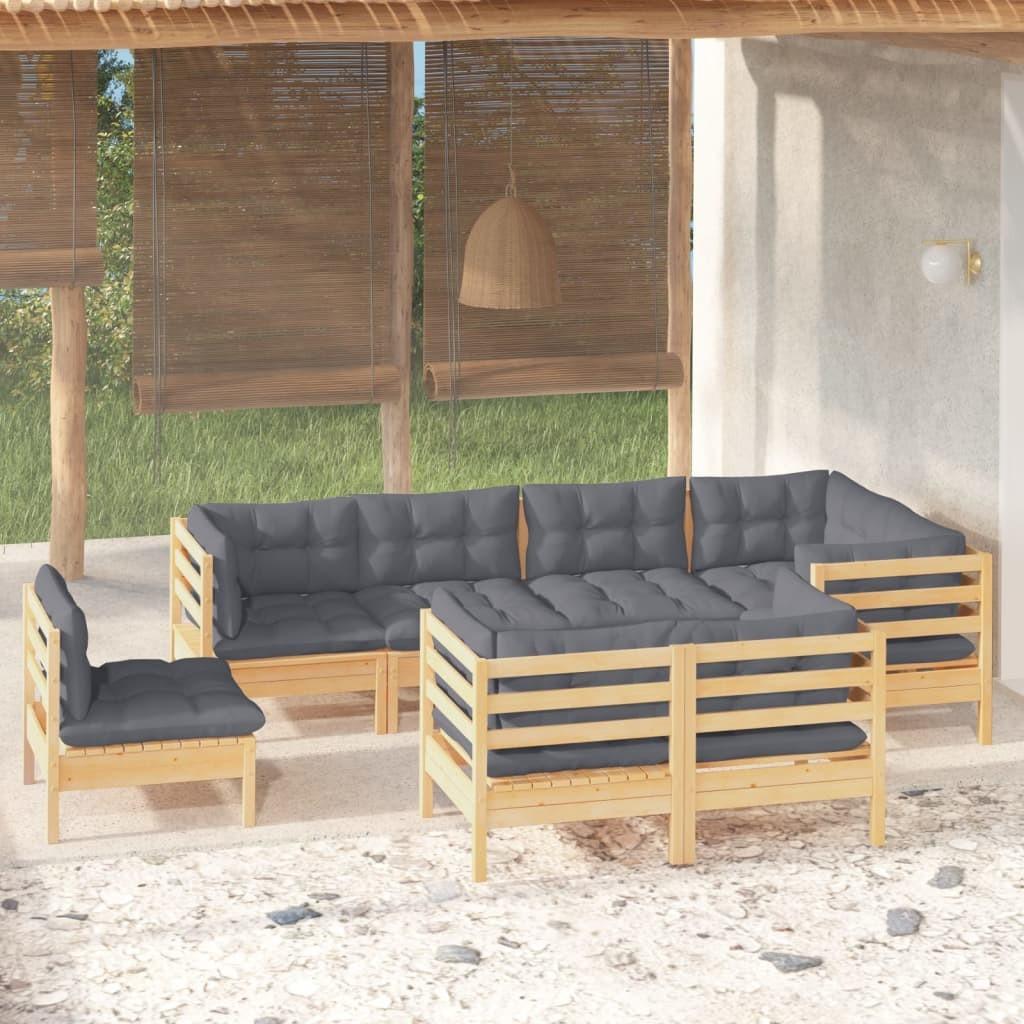 Loungesæt til haven 9 dele med grå hynder massivt fyrretræ
