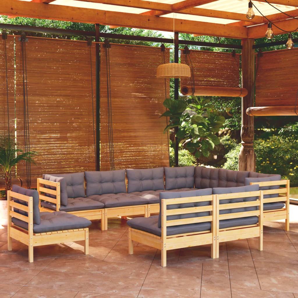 Loungesæt til haven 10 dele med grå hynder massivt fyrretræ
