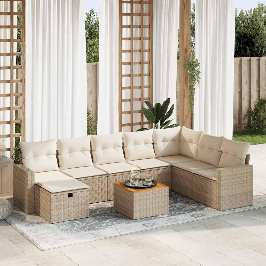 Spisebordssæt til haven 9 dele med hynder polyrattan beige