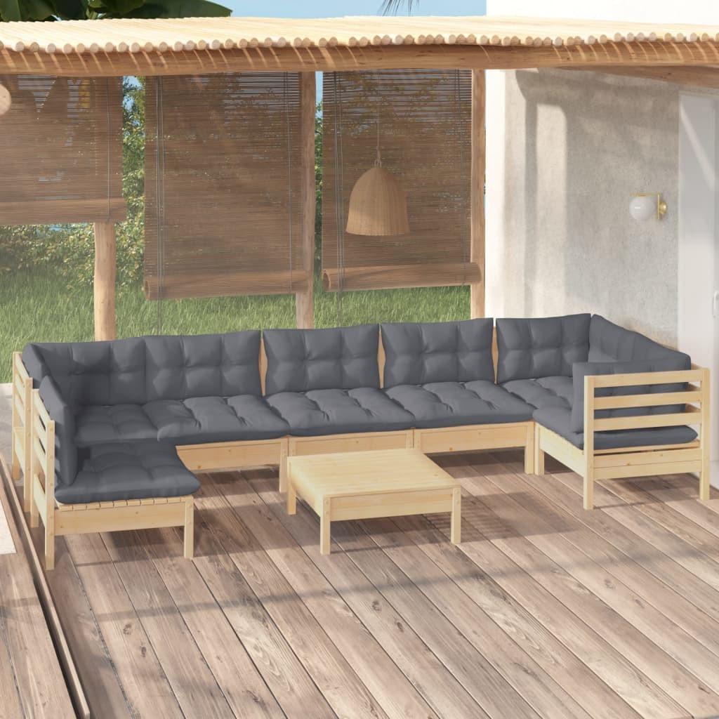 Loungesæt til haven 9 dele med grå hynder massivt fyrretræ