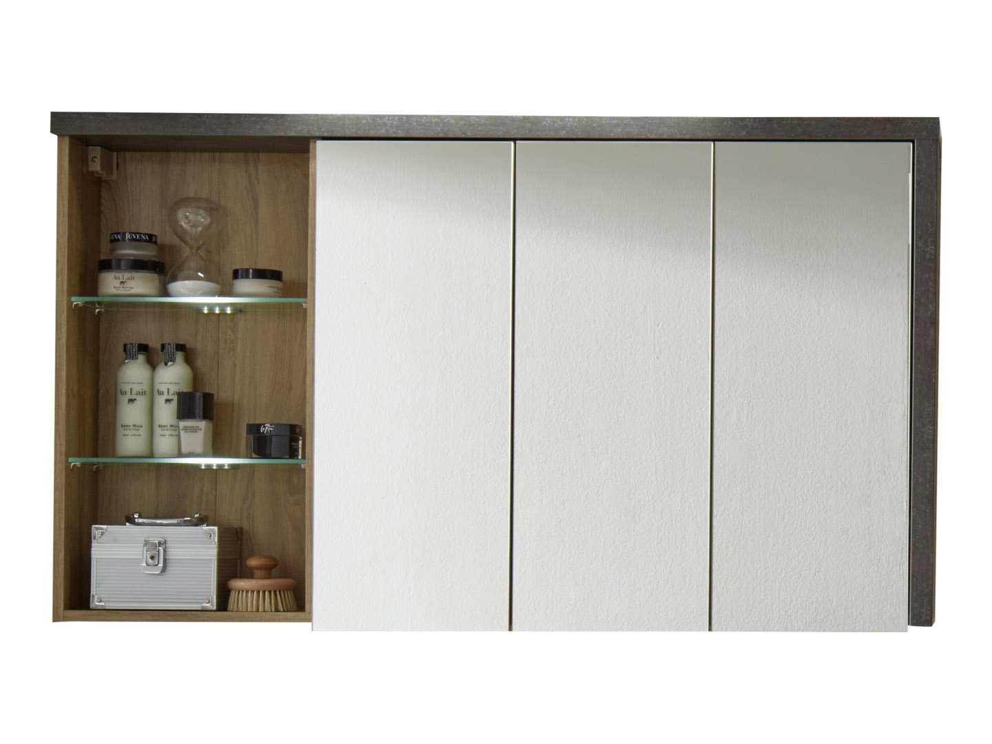 Bay spejlskab badeværelse 3 låger, 3 åbne rum honning eg dekor, beton dekor