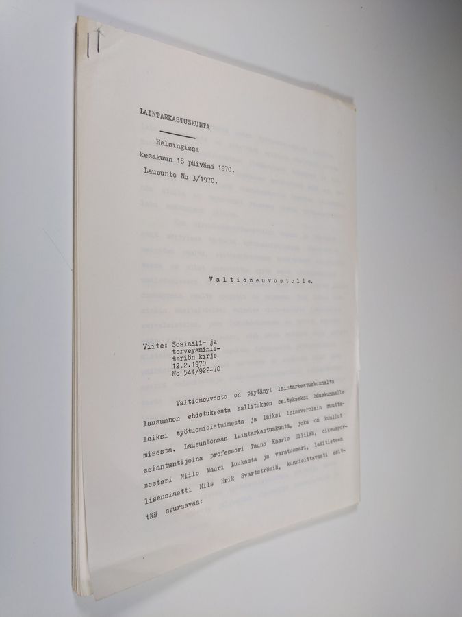 Laintarkastuskunnan lausunto ehdotuksesta hallituksen esitykseksi Eduskunnalle laiksi työtuomioistuimesta ja laiksi leimaverolain muuttamisesta