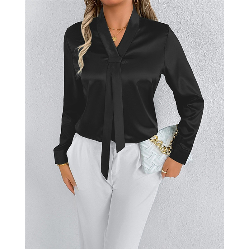 Women's Shirt Elegant Dressy Satin Solid Color Stylish Casual Long Sleeve V Neck Regular Tops Daily Going out Tie Front Black White Spring Fall