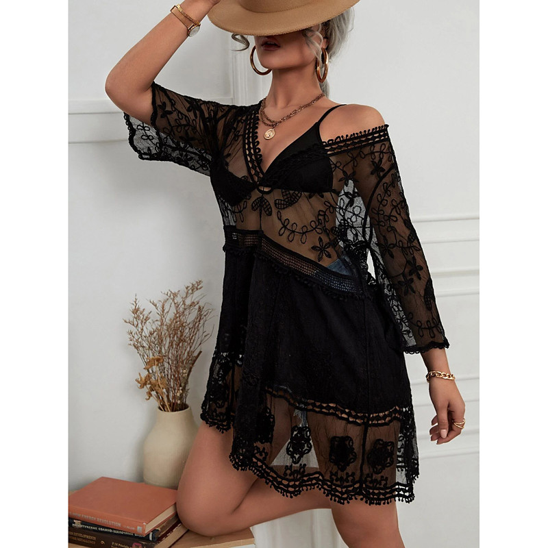 Women's Swimsuits Cover Up Swim Dress Swimsuit Lace Patchwork Vacation Beach Wear Solid Color V Neck Long Sleeve Bathing Suits