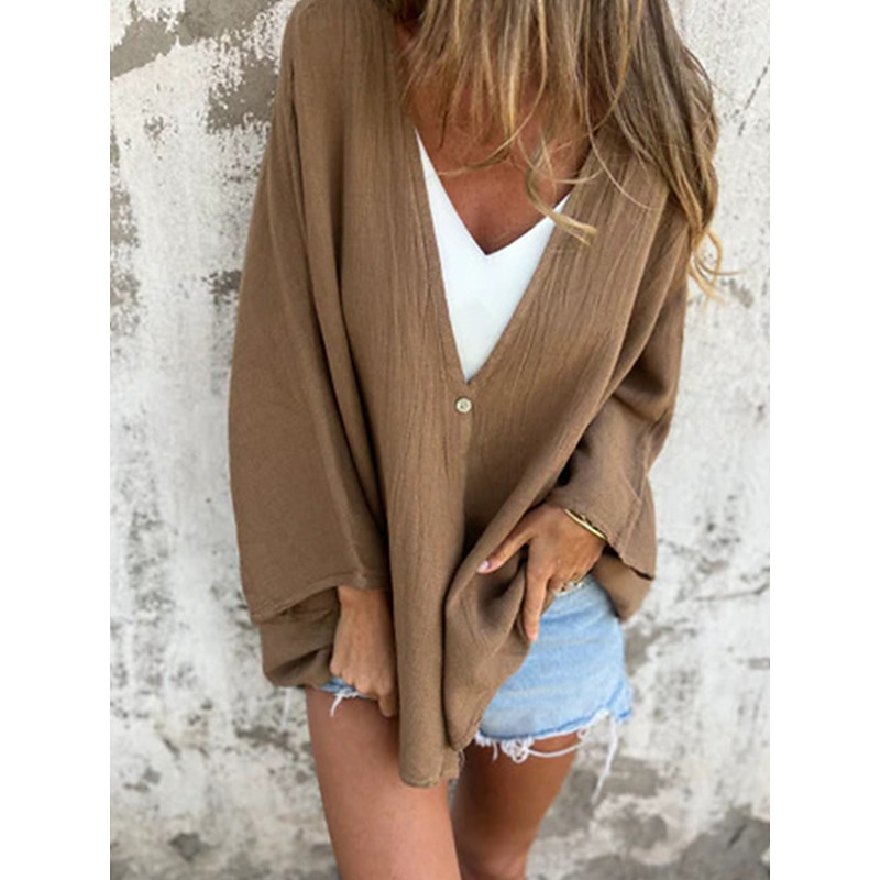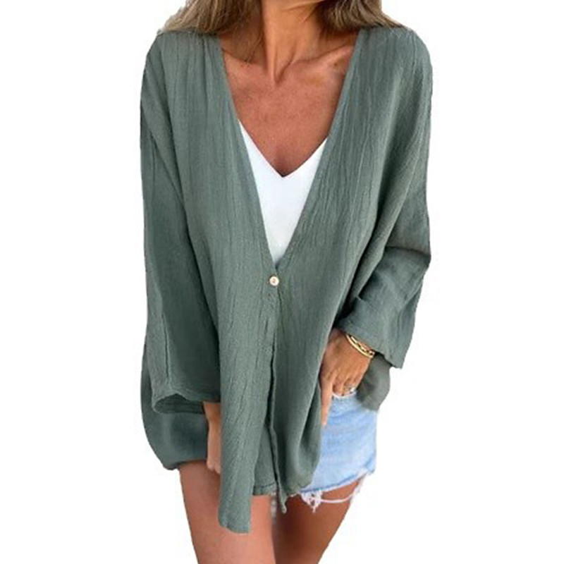 Women's Cotton Linen Blouse Shrugs Solid Color Basic Casual Long Sleeve V Neck Regular Tops Daily Buttons Black Orange Brown Green Dark Gray Summer