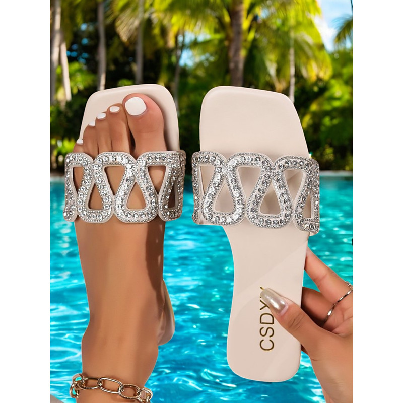 Women's Rhinestone Slide Sandals – Elegant Slip-On Flat Sandals with Sparkling Crystal Cutout Design for Summer, Beach and Casual Wear