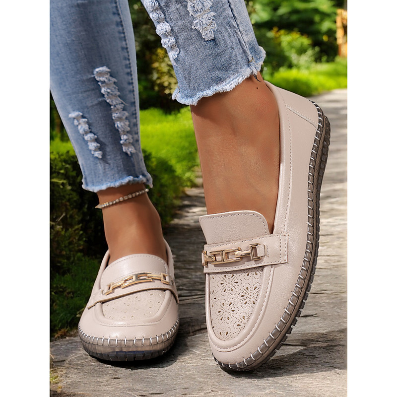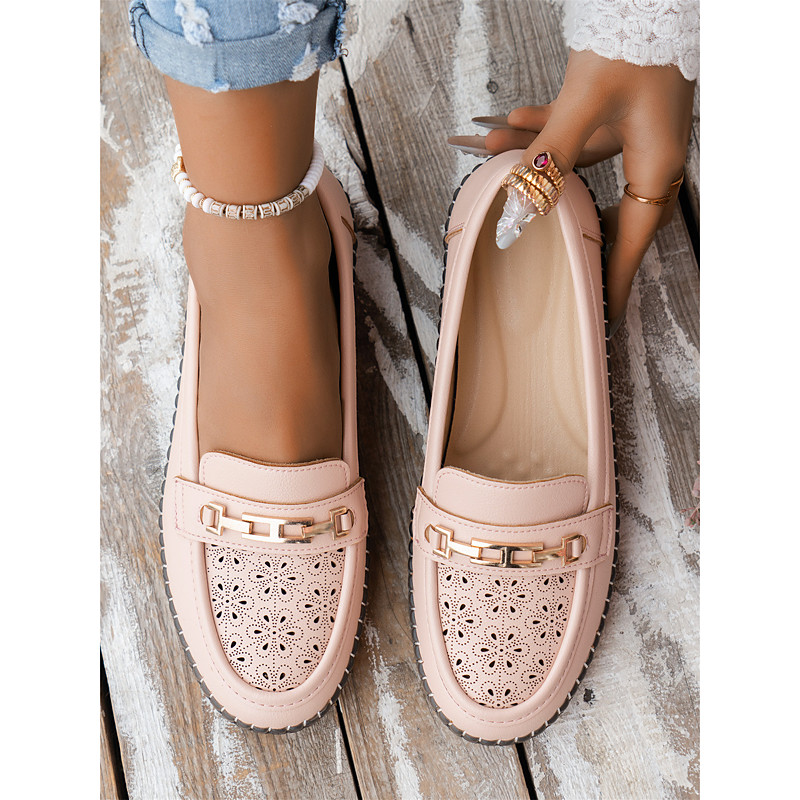 Women's Pink Loafer Moccasins - Breathable Hollow-Out Slip-On Flats with Metal Accent for Casual Workwear