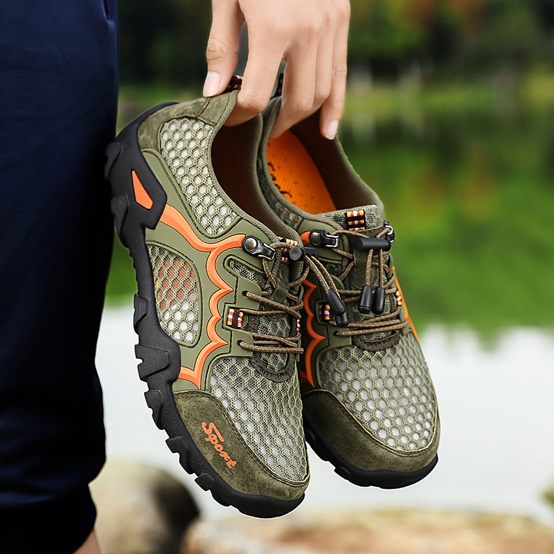Men's Outdoor Adventure Shoes, Rugged Orange Mesh with Lace-Up Design, Durable Trail Footwear
