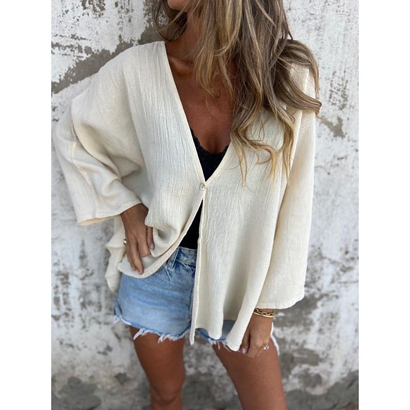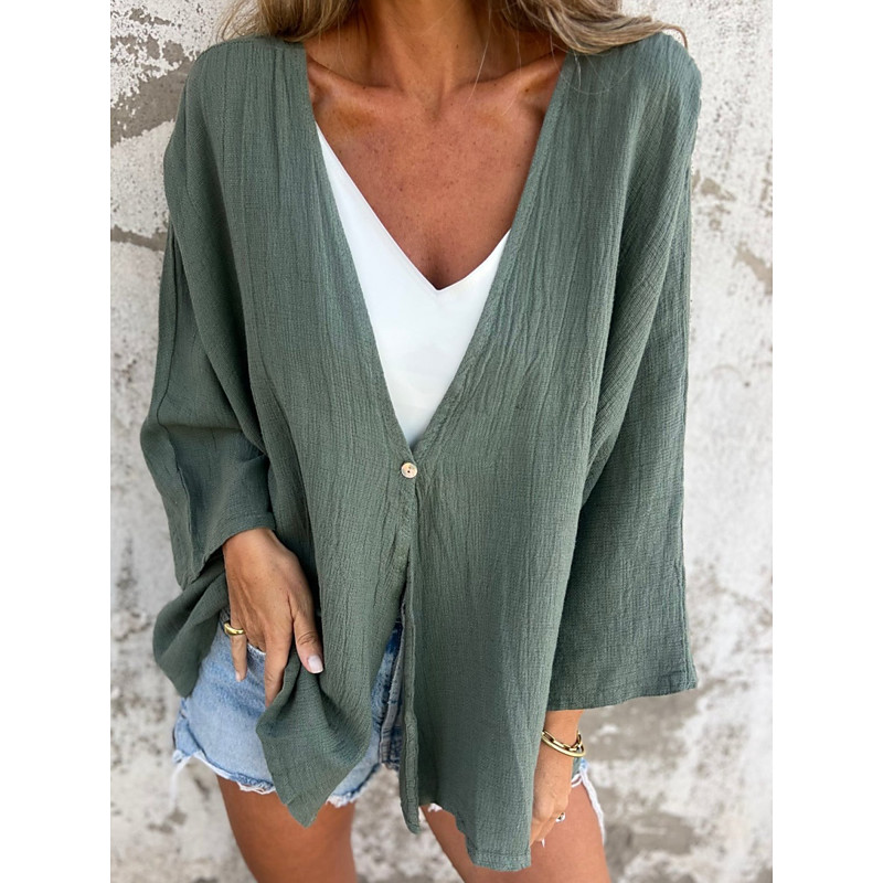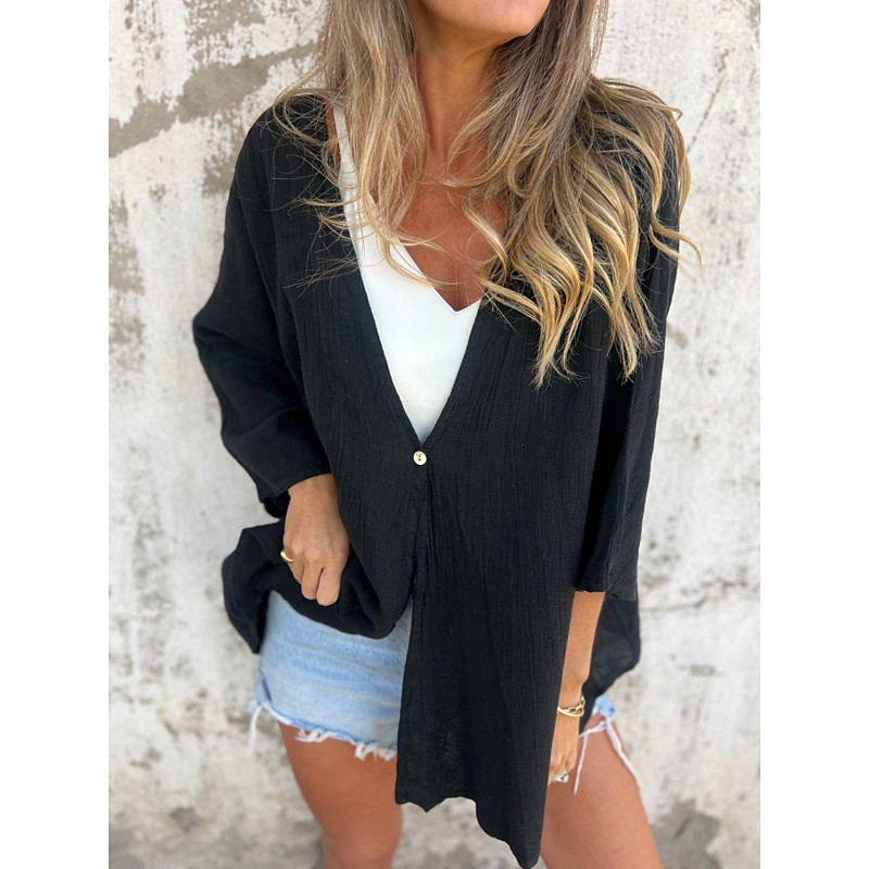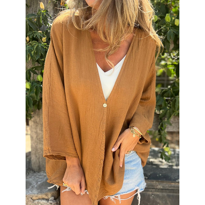 Women's Shirt Linen-Inspired Shirts Button Up Blouse Plain Basic Modern Long Sleeve V Neck Regular Tops Daily Holiday Buttons Black Orange Brown Green Beige Summer
