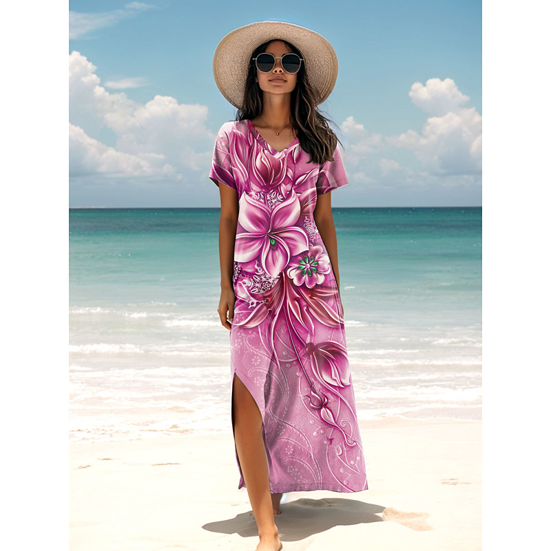 Women's Maxi Dress Sundress A Line Dress Summer Dress Vacation Casual Daily Regular Fit Floral Graphic Short Sleeve V Neck Pink Blue Purple Spring Fall