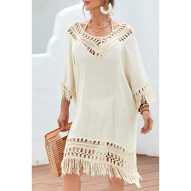 Women's Swimwear Cover Up Swimsuit Fringe Tropical Beach Wear Plain V Wire Long Sleeve Bathing Suits