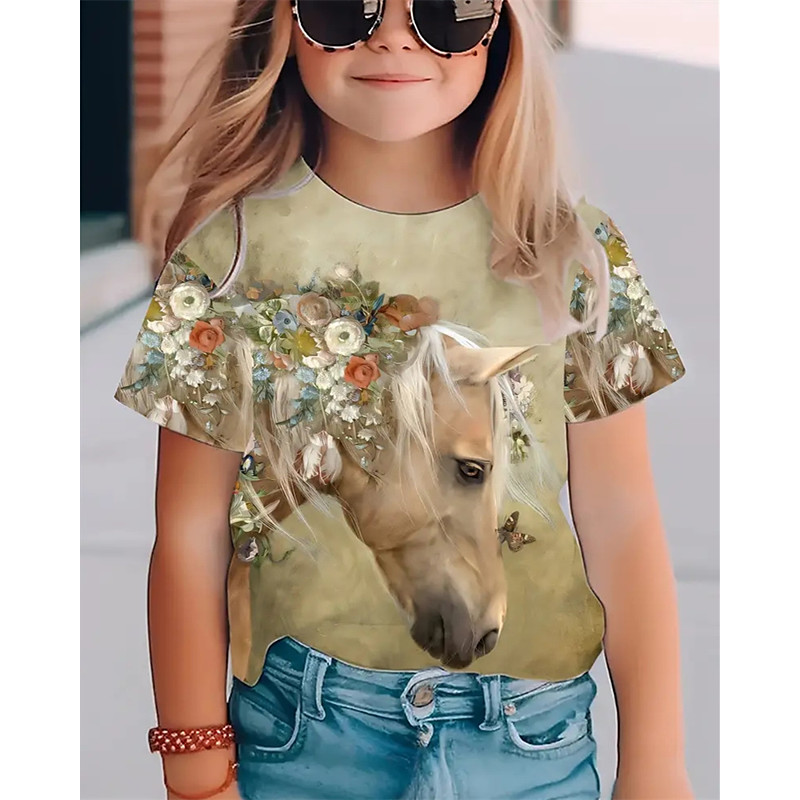 Girls' 3D Horse T shirt Tee Short Sleeve Summer Spring Fashion Basic Kids 4-12 Years Crew Neck Outdoor Casual Daily Regular Fit