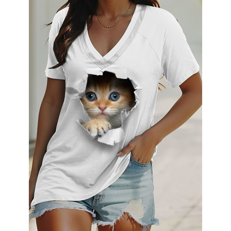 Women's T Shirt V Neck Long Sleeve Graphic Casual Animal Cat Short Sleeve Regular Tops Daily Weekend Cute Outfits Print White Green Summer