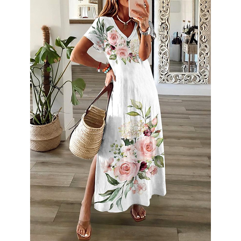 Women's Maxi Dress T Shirt Dress Tee Dress Sundress Shift Dress Summer Dress Bohemia Party Holiday Beach Regular Fit Floral Vintage Short Sleeve Crew Neck White Summer Spring
