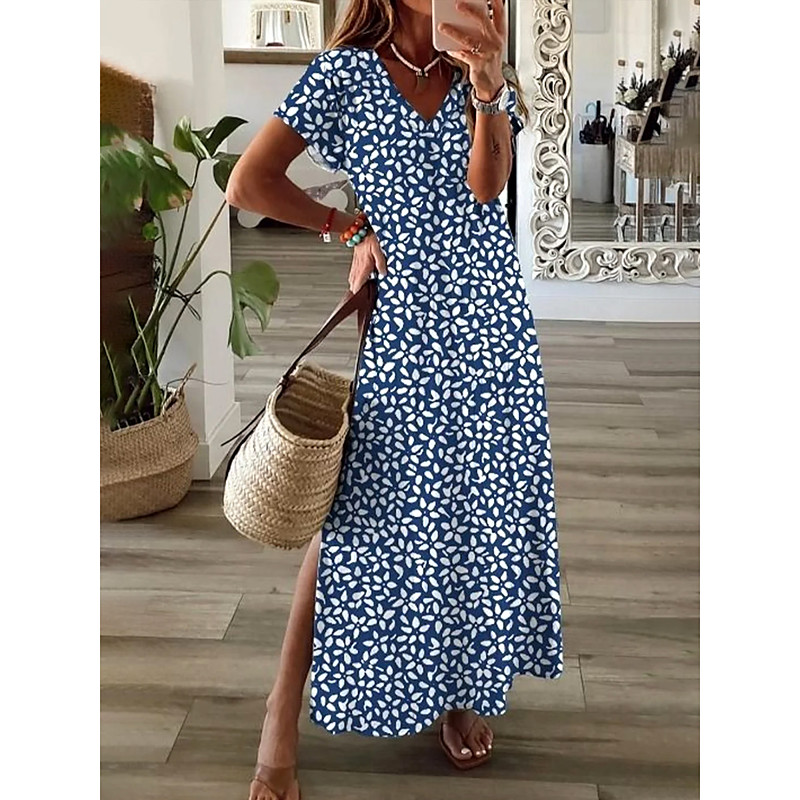 Women's Maxi Dress A Line Dress Summer Dress Elegant Vacation Casual Vacation Daily Regular Fit Floral Graphic Polka Dot Short Sleeve V Neck Dusty Blue Summer Spring Fall