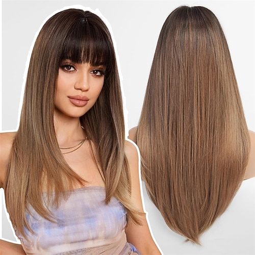 parrucche lunghe e lisce per donne con frangia a strati, parrucche sintetiche biondo cenere con radici scure per donne