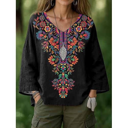 Per donna Blusa Floreale Grafico Geometrico Bohemien Vintage Hawaiano Manica Lunga Scollo a V Top Regolari Arricciato Stampato Nero Bianco Verde Estate Primavera